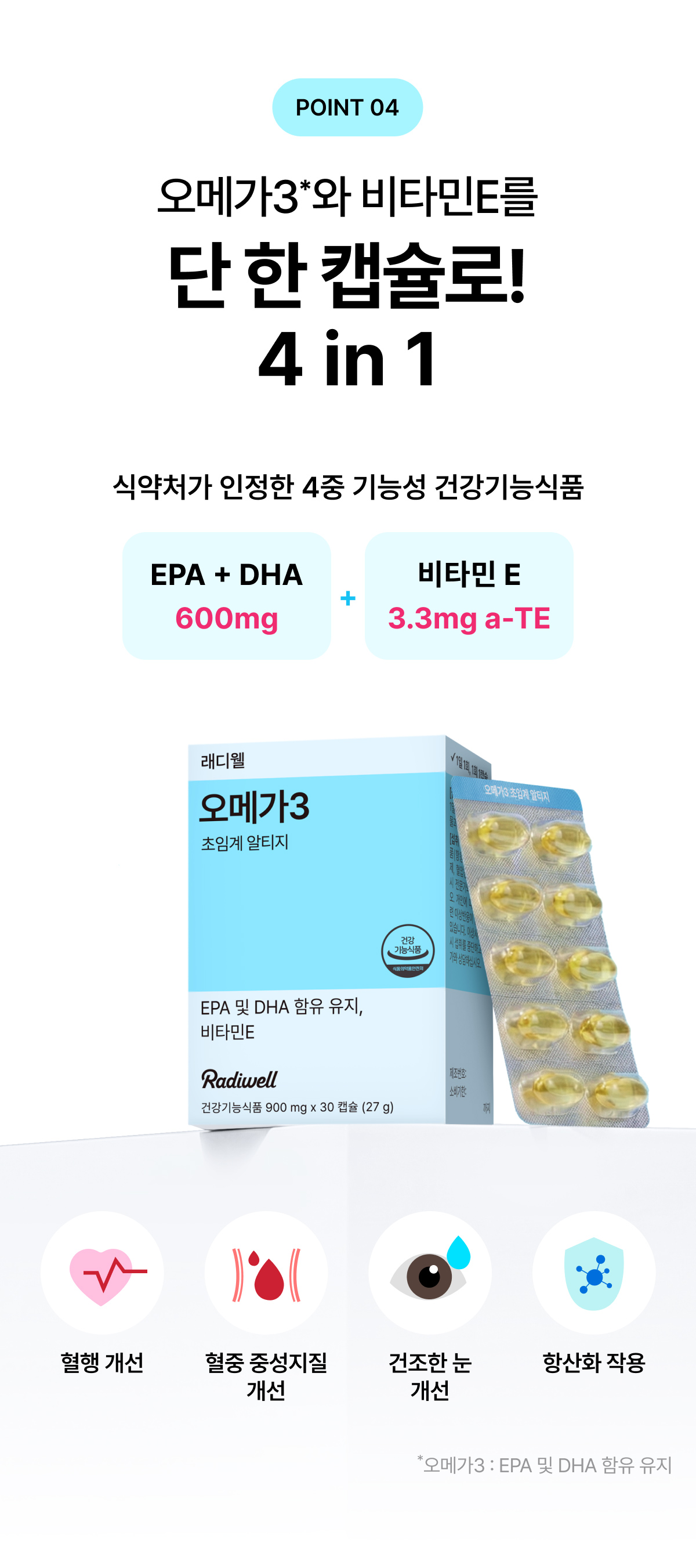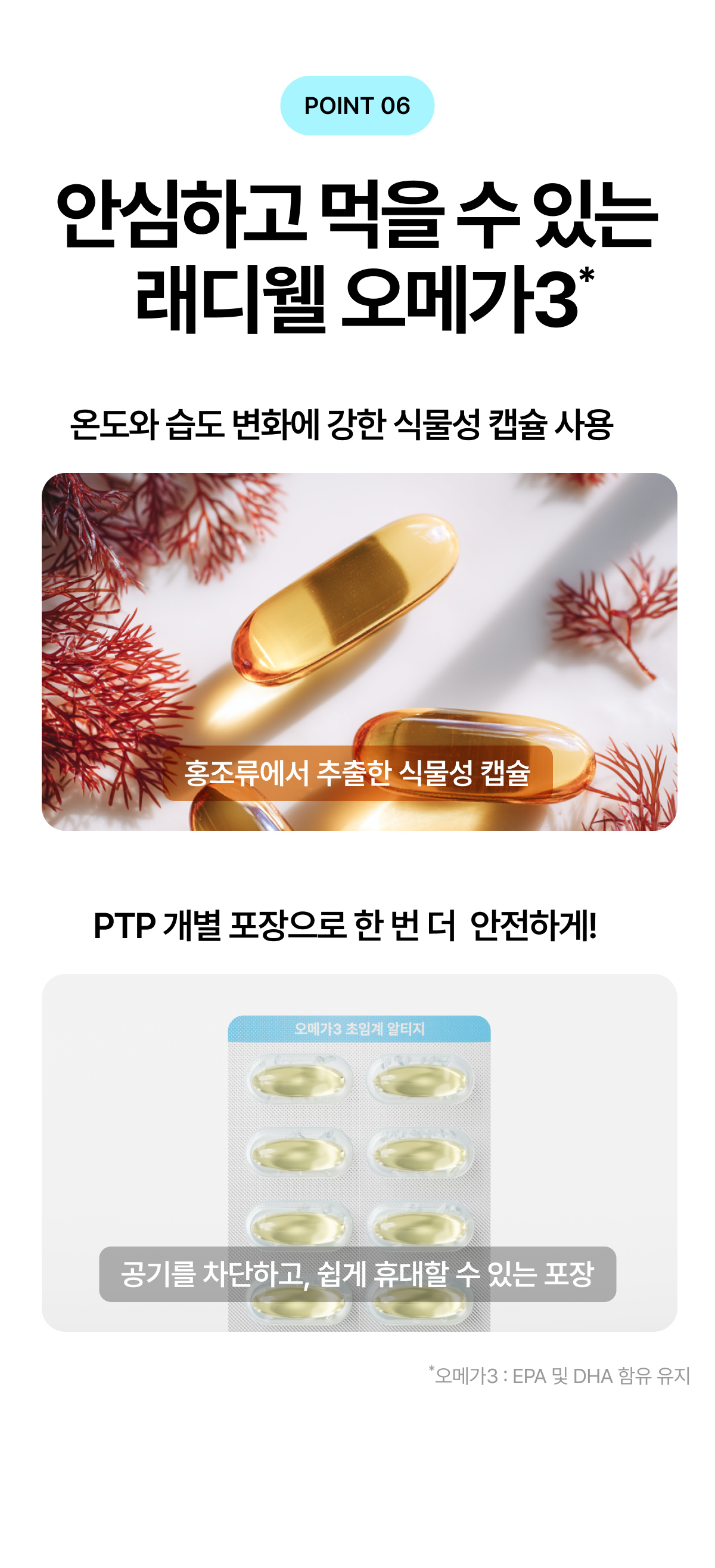 보통 이 정도 고스펙 제품은 가격대가 부담스러워 꾸준히 먹기 힘든데, 래디웰은 부담 없는 가격에 뛰어난 성분을 갖추고 있어 정말 매력적이더라고요. PTP 개별 포장이라 위생적이고, 식물성 캡슐이라 그런지 섭취 후에도 속이 편안하고 오메가3 특유의 비린내가 전혀 올라오지 않아 대만족입니다.