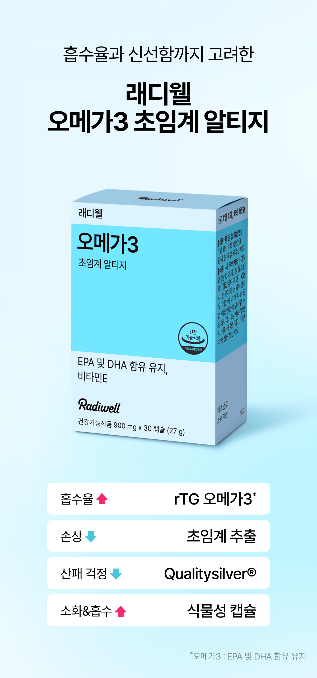 평소 믿고 먹는 프로바이오틱스 전문 브랜드 래디웰에서 나온 오메가3라 고민 없이 선택했어요. 혈행 건강과 건조한 눈 개선을 위해 챙겨 먹기 시작했는데, 무엇보다 초임계 추출 방식에 흡수율 높은 알티지형인데도 가격이 정말 합리적이라 놀랐습니다.